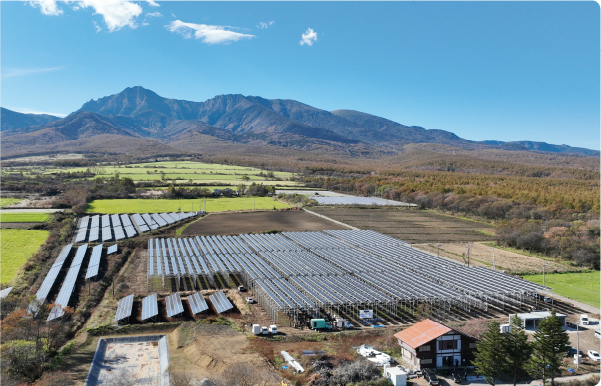 八ヶ岳を望む「野辺山営農ソーラー」。標高1350mの高地に3ha(25mプール100個分)の広さで発電と農業を展開。