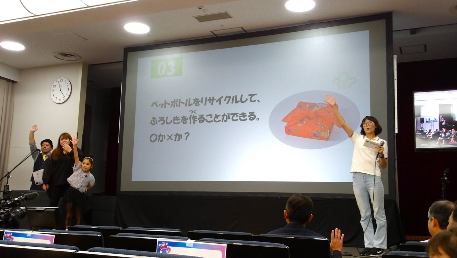 最終日の9月27日(土)には人気インフルエンサーの望蘭(みらん)ちゃんがステージイベントに登場し、会場に訪れた多くの来場者と一緒に、サーキュラーエコノミーについて楽しく学びました。その後、SIP第3期課題「サーキュラーエコノミーシステムの構築」の参画機関である総合地球環境学研究所※が開発した「プラのきもちゲーム」を紹介しました。望蘭ちゃんがステージ上でゲームを体験した後には、来場者を交えてプラスチックに関する知識を楽しく学べる〇×クイズ大会も行われました。