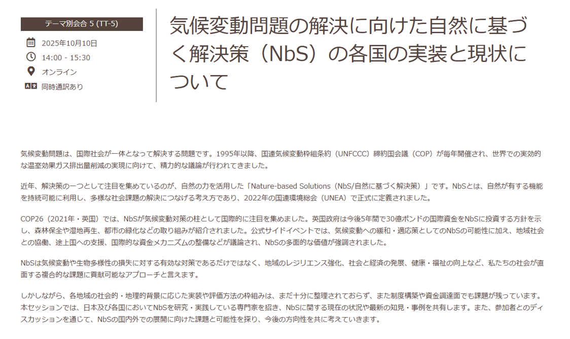 気候変動問題の解決策のひとつとして注目を集める「Nature-based Solutions(NbS/自然に基づく解決策)」。NbSは気候変動や生物多様性の損失に対する有効な対策であるだけではなく、地域のレジリエンス強化、社会と経済の発展、健康・福祉の向上など、私たちの社会が直面する複合的な課題に貢献可能なアプローチです。しかし、各地域の社会的・地理的背景に応じた実装や評価方法の枠組みは、まだ十分に整理されておらず、制度構築や資金調達面でも課題が残っています。