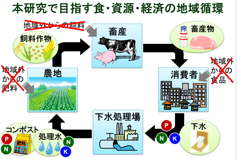 輸入飼料の価格が高騰する昨今、価格が安定した国産飼料の確保が重要になってきていますが、山形大学の渡部教授は、上記の取り組みを循環経済の中に位置づければ、農業にとどまらず、畜産にも役立つものとなり、「食」、「資源」、「経済」の循環が可能になると考えました。