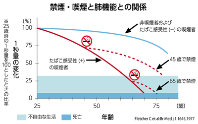 日本ではCOPDの原因の90%以上が喫煙によるものといわれており、COPDを予防するためには「禁煙」が最も大切です。たばこをやめれば、その後の肺機能の低下はたばこを吸わない人とほぼ同じになりますので、喫煙している方は今すぐにでも禁煙を始めましょう。