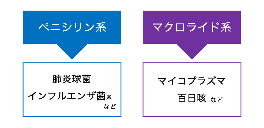 治療薬は百日咳と同じマクロライド系抗生剤です。インフルエンザや肺炎球菌などの一般的な呼吸器感染症を起こす細菌は細胞壁のある細菌の感染症で、抗生剤を選ぶときに細胞壁を壊す作用のあるペニシリン系などの抗生剤を選びますが、細胞壁のないマイコプラズマにはペニシリンが効かないので、マクロライド系を使います。